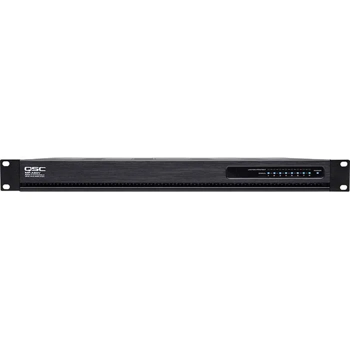 AMPLIFICADOR QSC MP-A80V MULTICANAL 8 SALIDAS con tecnología FlexAmp con la que cada pareja de canales comparte una potencia de 400 W y cada canal es capaz de transmitir con toda la potencia o compartirla en cualquier proporción. La serie MP-A ofrece una flexibilidad sorprendente para los negocios que necesitan aplicaciones de música y megafonía, a la vez que mantiene una gran eficiencia y un bajo costo total de propiedad. Diseño de amplificador de rack de 1U para ahorrar espacio. Selector de carga para manejar 4 Ω, 8 Ω, 70 V o 100 V en cada canal. Modelo de 8 canales.